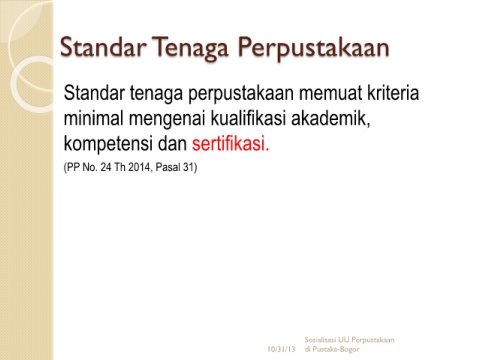 Standar Tenaga Perpustakaan Standar tenaga perpustakaan memuat kriteria minimal mengenai kualifikasi akademik, kompetensi dan sertifikasi. (PP No. 24 Th 2014, Pasal 31) Sosialisasi UU Perpustakaan 10/31/13 di Pustaka-Bogor