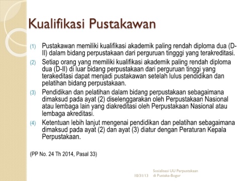(1) Pustakawan memiliki kualifikasi akademik paling rendah diploma dua (D-