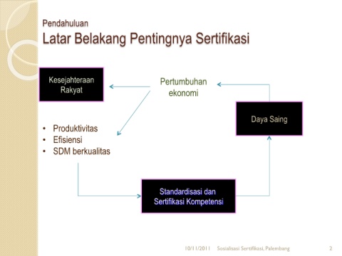 Pendahuluan Latar Belakang Pentingnya Sertifikasi Kesejahteraan Pertumbuhan Rakyat ekonomi Daya Saing • Produktivitas • Efisiensi • SDM berkualitas Standardisasi dan Sertifikasi Kompetensi 10/11/2011 Sosialisasi Sertifikasi, Palembang 2